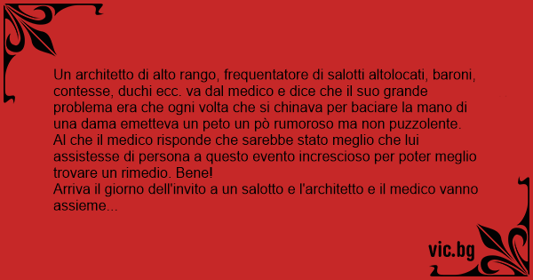 Un architetto di alto rango, frequentatore di salotti altolocati, baroni, contesse, duchi ecc. va dal medico e dice che il suo grande problema era che ogni volta che si chinava per baciare la mano di una dama emetteva un peto un pò rumoroso ma non puzzolente.