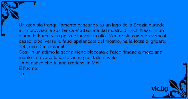 Un ateo sta tranquillamente pescando su un lago della Scozia quando all’improvviso la sua barca e’ attaccata dal mostro di Loch Ness. In un attimo la barca va a pezzi e lui vola in alto. Mentre sta cadendo verso il basso, cioe’ verso le fauci spalancate del mostro, ha la forza di gridare: