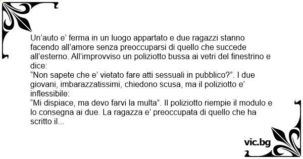 “Mi dispiace, ma devo farvi la multa”. Il poliziotto riempie il modulo e lo consegna ai due. La ragazza e’ preoccupata di quello che ha scritto il poliziotto sul verbale e, mentre si riveste, chiede al suo ragazzo di leggere il foglio. E il ragazzo legge:
