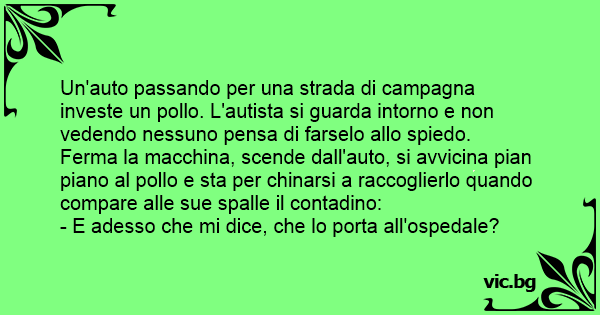 Ferma la macchina, scende dall'auto, si avvicina pian piano al pollo e sta per chinarsi a raccoglierlo quando compare alle sue spalle il contadino: