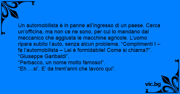 Un automobilista è in panne all’ingresso di un paese. Cerca un’officina, ma non ce ne sono, per cui lo mandano dal meccanico che aggiusta le macchine agricole. L’uomo ripara subito l’auto, senza alcun problema. “Complimenti ! – fa l’automobilista – Lei è formidabile! Come si chiama?”.