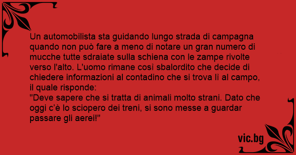 Un automobilista sta guidando lungo strada di campagna quando non può fare a meno di notare un gran numero di mucche tutte sdraiate sulla schiena соn le zampe rivolte verso l'alto. L'uomo rimane così sbalordito che decide di chiedere informazioni al contadino che si trova lì al campo, il quale risponde: