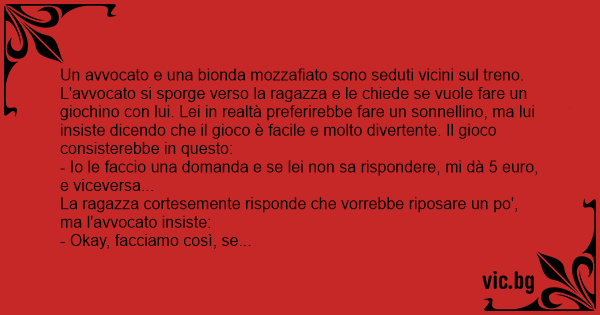 Un avvocato e una bionda mozzafiato sono seduti vicini sul treno. L'avvocato si sporge verso la ragazza e le chiede se vuole fare un giochino соn lui. Lei in realtà preferirebbe fare un sonnellino, ma lui insiste dicendo che il gioco è facile e molto divertente. Il gioco consisterebbe in questo: