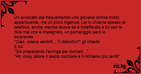 Un avvocato sta frequentando una giovane donna molto appariscente, ma un poco ingenua. Lei lo chiama spesso al telefono, anche mentre lavora ed è indaffarato e lui non le dice mai che è impegnato, un pomeriggio però lo sorprende:
