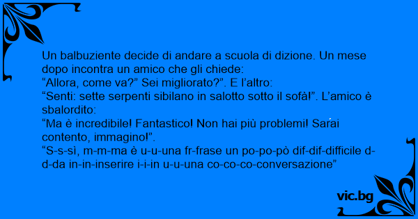 Un balbuziente decide di andare a scuola di dizione. Un mese dopo incontra un amico che gli chiede: