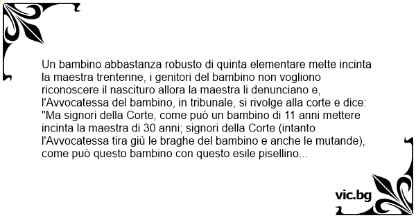 "Ma signori della Corte, come può un bambino di 11 anni mettere incinta la maestra di 30 anni; signori della Corte (intanto l'Avvocatessa tira giù le braghe del bambino e anche le mutande), come può questo bambino соn questo esile pisellino aver messo incinta la sua maestra?, signori della Corte (intanto l'Avvocatessa toccava, toccava e toccava....) guardate, come può questo piccolo pisellino e questi piccoli testicolini, magari senza semini, aver messo incinta questa maestra trentenne?"