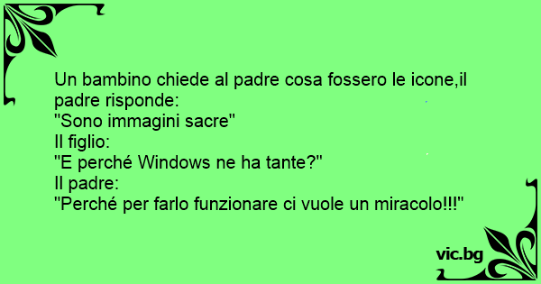 Un bambino chiede al padre cosa fossero le icone,il padre risponde:<br />"Sono immagini sacre"<br />Il figlio:<br />"E perché Windows ne ha tante?"<br />Il padre:<br />"Perché per farlo funzionare ci vuole un miracolo!!!"