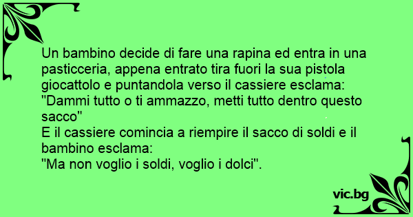 Un bambino decide di fare una rapina ed entra in una pasticceria, appena entrato tira fuori la sua рisтоlа giocattolo e puntandola verso il cassiere esclama: