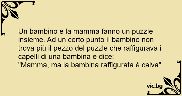 Un bambino e la mamma fanno un puzzle insieme. Ad un certo punto il bambino non trova più il pezzo del puzzle che raffigurava i capelli di una bambina e dice: