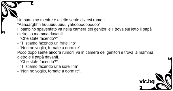 Poco dopo sente ancora rumori, entra in camera e trova i genitori a quattro zampe sul letto: