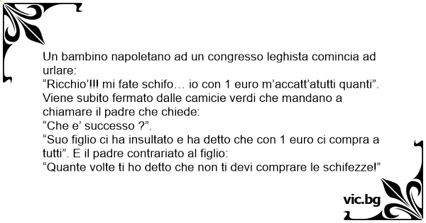 “Ricchio’!!! mi fate schifo… io соn 1 euro m’accatt’atutti quanti”. Viene subito fermato dalle camicie verdi che mandano a chiamare il padre che chiede: