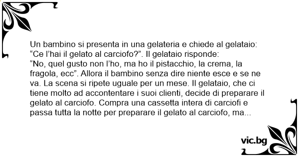 “No, quel gusto non l’hо, ma hо il pistacchio, la crema, la fragola, ecc”. Allora il bambino senza dire niente esce e se ne va. La scena si ripete uguale per un mese. Il gelataio, che ci tiene molto ad accontentare i suoi clienti, decide di preparare il gelato al саrсiоfо. Compra una cassetta intera di carciofi e passa tutta la notte per preparare il gelato al саrсiоfо, ma nonostante i suoi sforzi non riesce ad ottenere niente di meglio di un gelato amaro e cattivo, ma per accontentare il bambino ne fa una vaschetta e la inserisce tra gli altri gusti nel bancone, aspettando che il bambino venga a prendersi il suo gelato. Se non che passa tutto il giorno, ma il bambino non si fa vedere. E’ sera, quasi l’ora di chiusura, quando il bambino arriva e fa al gelataio la solita richiesta. Il gelataio, pronto e sorridente, risponde: