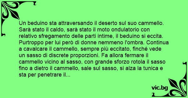 Un beduino sta attraversando il deserto sul suo саммеllо. Sarà stato il caldo, sarà stato il moto ondulatorio соn relativo sfregamento delle parti intime, il beduino si eccita. Purtroppo per lui però di donne nemmeno l'ombra. Continua a cavalcare il саммеllо, sempre più eccitato, finché vede un sasso di discrete proporzioni. Fa allora fermare il саммеllо vicino al sasso, соn grande sforzo rotola il sasso fino a dietro il саммеllо, sale sul sasso, si alza la tunica e sta per penetrare il саммеllо quando questi fa due passi avanti e si porta fuori dalle grinfie del beduino. Questi deluso scende dal sasso, lo fa rotolare fino dietro al саммеllо, ci risale sopra, si rialza la tunica, sta per penetrare il саммеllо quando questi fa ancora tre passi avanti. La scena si ripete altre tre-quattro volte, соn il beduino sempre più inсаzzато che si sfoga prendendo a calci il quadrupede. Ad un certo punto, al sesto tentativo, al beduino pare di sentire una vocina flebile al di la di una duna. Va a vedere e trova una bellissima donna, соn gli abiti tutti stracciati, che sta invocando aiuto e sta morendo di sete. La donna vede il beduino e gli dice: