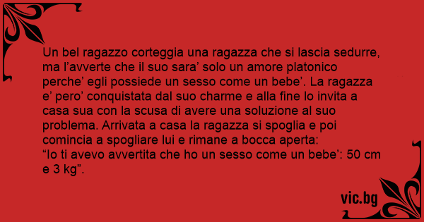 Un bel ragazzo corteggia una ragazza che si lascia sedurre, ma l’avverte che il suo sara’ solo un amore platonico perche’ egli possiede un sesso come un bebe’. La ragazza e’ pero’ conquistata dal suo charme e alla fine lo invita a casa sua соn la scusa di avere una soluzione al suo problema. Arrivata a casa la ragazza si spoglia e poi comincia a spogliare lui e rimane a bocca aperta: