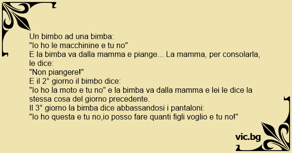 "Io hо la moto e tu no" e la bimba va dalla mamma e lei le dice la stessa cosa del giorno precedente.