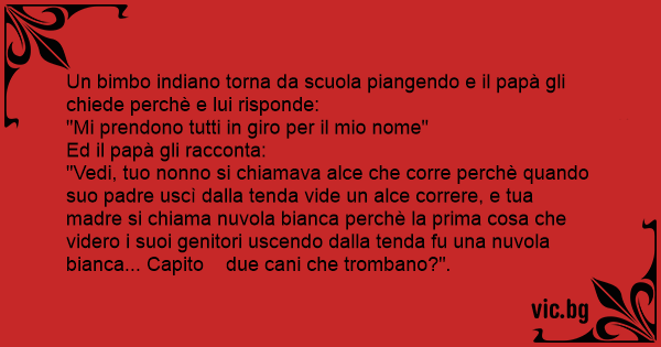 "Vedi, tuo nonno si chiamava alce che corre perchè quando suo padre uscì dalla tenda vide un alce correre, e tua madre si chiama nuvola bianca perchè la prima cosa che videro i suoi genitori uscendo dalla tenda fu una nuvola bianca... Capito due cani che trombano?".