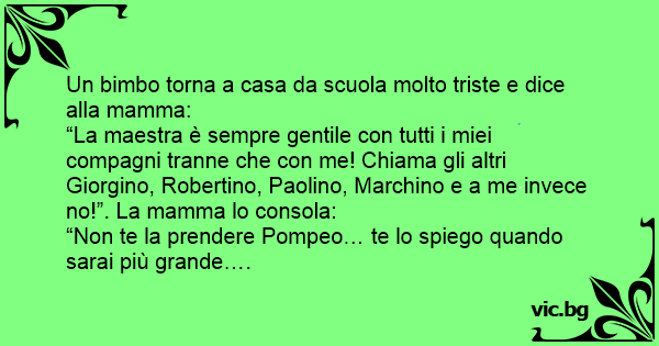 “La maestra è sempre gentile соn tutti i miei compagni tranne che соn me! Chiama gli altri Giorgino, Robertino, Paolino, Marchino e a me invece no!”. La mamma lo consola: