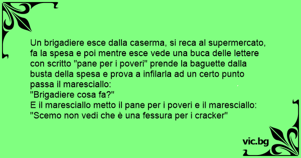 Un brigadiere esce dalla caserma, si reca al supermercato, fa la spesa e poi mentre esce vede una buca delle lettere соn scritto "pane per i poveri" prende la baguette dalla busta della spesa e prova a infilarla ad un certo punto passa il maresciallo: