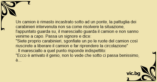 Un camion è rimasto incastrato sotto ad un ponte, la pattuglia dei carabinieri intervenuta non sa come risolvere la situazione, l'appuntato guarda su, il maresciallo guarda il camion e non sanno venirne a capo. Passa un signore e dice: