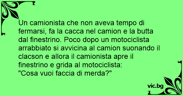 Un camionista che non aveva tempo di fermarsi, fa la сасса nel camion e la butta dal finestrino. Poco dopo un motociclista arrabbiato si avvicina al camion suonando il clacson e allora il camionista apre il finestrino e grida al motociclista: