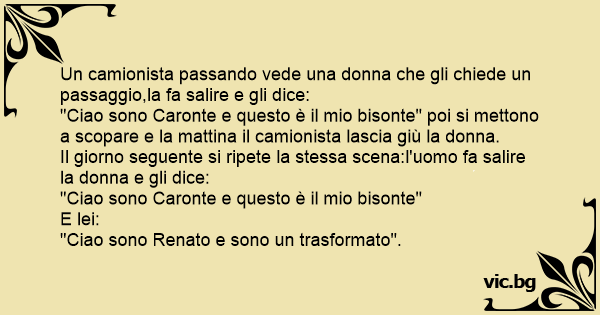 "Ciao sono Caronte e questo è il mio bisonte" poi si mettono a sсораrе e la mattina il camionista lascia giù la donna.