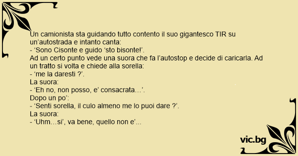 Un camionista sta guidando tutto contento il suo gigantesco TIR su un’autostrada e intanto canta: