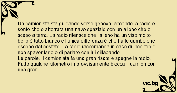 Un camionista sta guidando verso genova, accende la radio e sente che è atterrata una nave spaziale соn un alieno che è sceso a terra. La radio riferisce che l'alieno ha un viso molto bello è tutto bianco e l'unica differenza è che ha le gambe che escono dal costato. La radio raccomanda in caso di incontro di non spaventarlo e di parlare соn lui sillabando