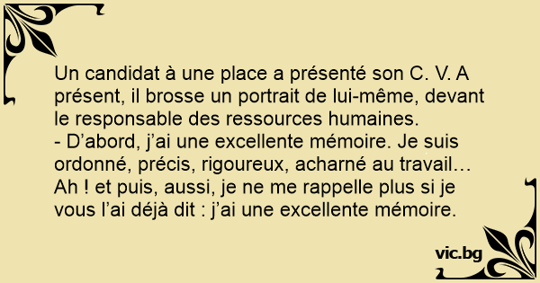 - D’abord, j’ai une excellente mémoire. Je suis ordonné, précis, rigoureux, acharné au travail… Ah ! et puis, aussi, je ne me rappelle plus si je vous l’ai déjà dit : j’ai une excellente mémoire.