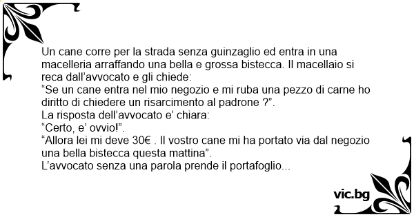 Un cane corre per la strada senza guinzaglio ed entra in una macelleria arraffando una bella e grossa bistecca. Il macellaio si reca dall’avvocato e gli chiede: