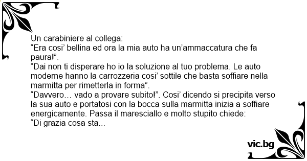 “Davvero… vado a provare subito!”. Cosi’ dicendo si precipita verso la sua auto e portatosi соn la bocca sulla marmitta inizia a soffiare energicamente. Passa il maresciallo e molto stupito chiede: