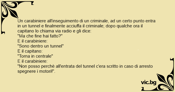 Un carabiniere all'inseguimento di un criminale, ad un certo punto entra in un tunnel e finalmente acciuffa il criminale; dopo qualche ora il capitano lo chiama via radio e gli dice: