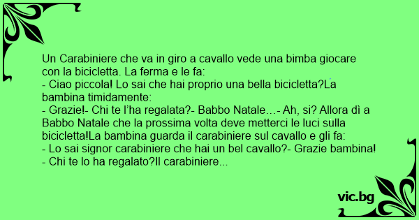 - Grazie!- Chi te l’ha regalata?- Babbo Natale…- Ah, si? Allora dì a Babbo Natale che la prossima volta deve metterci le luci sulla bicicletta!La bambina guarda il carabiniere sul cavallo e gli fa: