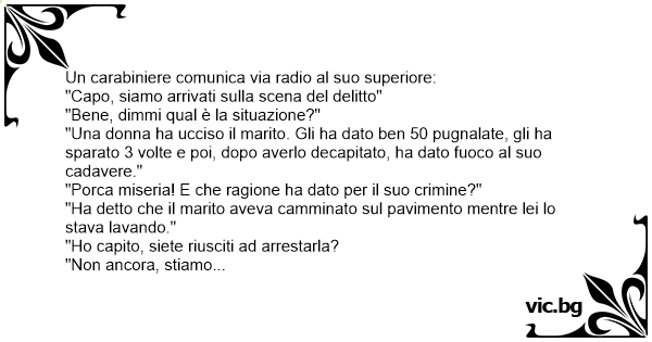 Unité d'intervention de police. - Chef, une femme vient de tuer son mari ! - Ok quel est le mobile du crime ? - Apparemment le mari aurait marché dans le salon alors qu'elle passait la serpillière. - D'accord, et vous l'avez interpelé ? - Bah non chef, le sol n'est pas encore sec.
