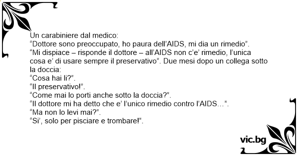 “Mi dispiace – risponde il dottore – all’AIDS non c’e’ rimedio, l’unica cosa e’ di usare sempre il preservativo”. Due mesi dopo un collega sotto la doccia: