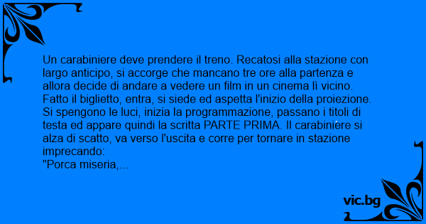Fatto il biglietto, entra, si siede ed aspetta l'inizio della proiezione. Si spengono le luci, inizia la programmazione, passano i titoli di testa ed appare quindi la scritta PARTE PRIMA. Il carabiniere si alza di scatto, va verso l'uscita e corre per tornare in stazione imprecando: