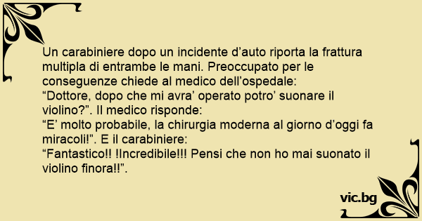 Un carabiniere dopo un incidente d’auto riporta la frattura multipla di entrambe le mani. Preoccupato per le conseguenze chiede al medico dell’ospedale: