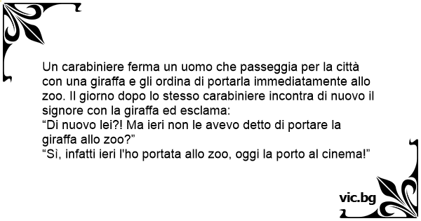 Un carabiniere trova un pinguino per la strada per cui telefona in centrale per chiedere cosa farne. "Portalo allo zoo". Il giorno dopo ritelefona e chiede: "E oggi dove lo porto, al cinema?".