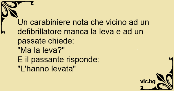 Un carabiniere nota che vicino ad un defibrillatore manca la leva e ad un passate chiede:<br />"Ma la leva?"<br />E il passante risponde:<br />"L'hanno levata"