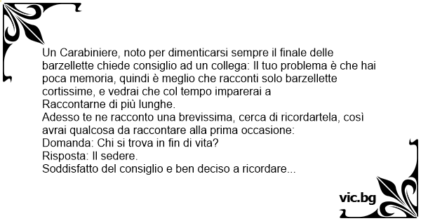 Un Carabiniere, noto per dimenticarsi sempre il finale delle barzellette chiede consiglio ad un collega: Il tuo problema è che hai poca memoria, quindi è meglio che racconti solo barzellette cortissime, e vedrai che col tempo imparerai a