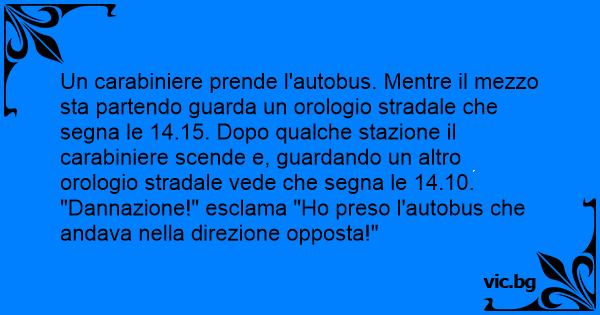 Un carabiniere prende l'autobus. Mentre il mezzo sta partendo guarda un orologio stradale che segna le 14.15. Dopo qualche stazione il carabiniere scende e, guardando un altro orologio stradale vede che segna le 14.10. "Dannazione!" esclama "Но preso l'autobus che andava nella direzione opposta!"