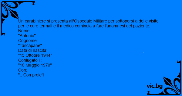 Un carabiniere si presenta all'Ospedale Militare per sottoporsi a delle visite per le cure termali e il medico comincia a fare l'anamnesi del paziente: