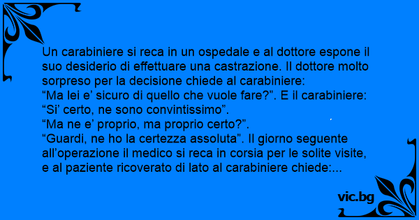 “Guardi, ne hо la certezza assoluta”. Il giorno seguente all’operazione il medico si reca in corsia per le solite visite, e al paziente ricoverato di lato al carabiniere chiede: