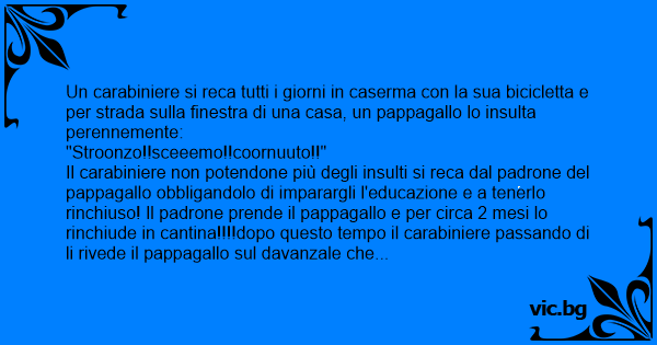 Il carabiniere non potendone più degli insulti si reca dal padrone del pappagallo obbligandolo di imparargli l'educazione e a tenerlo rinchiuso! Il padrone prende il pappagallo e per circa 2 mesi lo rinchiude in cantina!!!!dopo questo tempo il carabiniere passando di li rivede il pappagallo sul davanzale che però non diceva niente, si avvicina e gli fa:
