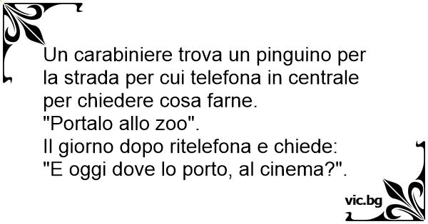 Een man vindt een pinguin op de straat. Hij gaat naar de politiebureau met de pinguin. "Ik heb een pinguin gevonden:Wat moet ik ermee doen?" vraagt hij. "U moet hem meenemen naar de dierentuin"...