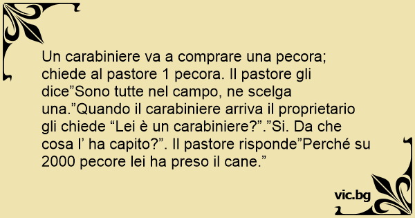 Un carabiniere va a comprare una pecora; chiede al pastore 1 pecora. Il pastore gli dice”Sono tutte nel campo, ne scelga una.”Quando il carabiniere arriva il proprietario gli chiede “Lei è un carabiniere?”.”Si. Da che cosa l’ ha capito?”. Il pastore risponde”Perché su 2000 pecore lei ha preso il cane.”