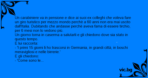 Un carabiniere va in pensione e dice ai suoi ex colleghi che voleva fare un giro turistico per mezzo mondo perchè a 60 anni non era mai uscito dall'Italia. Dubitando che andasse perchè aveva fama di essere tirchio, per 6 mesi non lo vedono più.