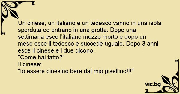Un cinese, un italiano e un tedesco vanno in una isola sperduta ed entrano in una grotta. Dopo una settimana esce l'italiano mezzo morto e dopo un mese esce il tedesco e succede uguale. Dopo 3 anni esce il cinese e i due dicono:
