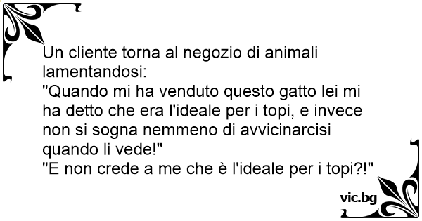 "Quando mi ha venduto questo gatto lei mi ha detto che era l'ideale per i topi, e invece non si sogna nemmeno di avvicinarcisi quando li vede!"