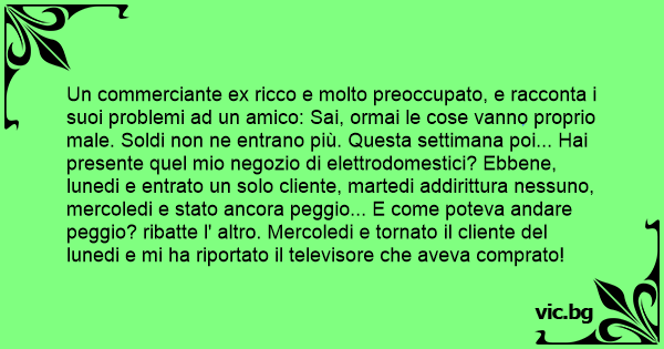Un commerciante ex ricco e molto preoccupato, e racconta i suoi problemi ad un amico: Sai, ormai le cose vanno proprio male. Soldi non ne entrano più. Questa settimana poi... Hai presente quel mio negozio di elettrodomestici? Ebbene, lunedi e entrato un solo cliente, martedi addirittura nessuno, mercoledi e stato ancora peggio... E come poteva andare peggio? ribatte l' altro. Mercoledi e tornato il cliente del lunedi e mi ha riportato il televisore che aveva comprato!