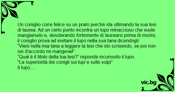 Un coniglio corre felice su un prato perché sta ultimando la sua tesi di laurea. Ad un certo punto incontra un lupo minaccioso che vuole mangiarselo e, desiderando fortemente di laurearsi prima di morire, il coniglio prova ad invitare il lupo nella sua tana dicendogli: